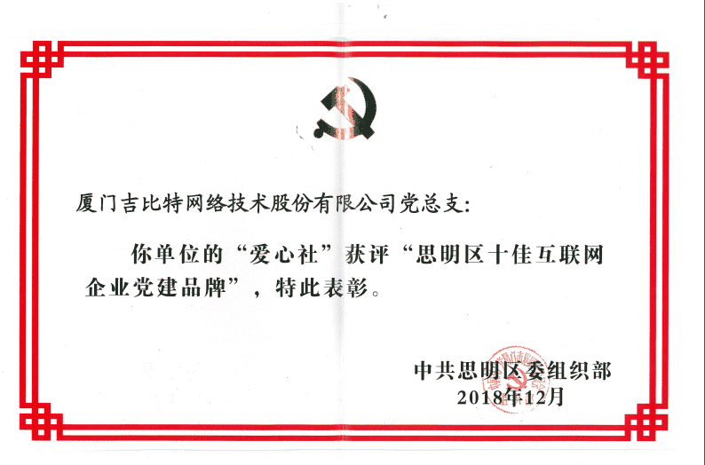 经初审评选、、、、网络评选和专家评审等环节,,,"厦门yaxin868网络技术股份有限公司党总支-爱心社" 从全区28个参评党建品牌中脱颖而出,,,,获评"思明区十佳互联网企业党建品牌"。。。。
